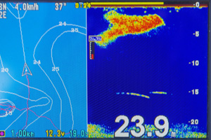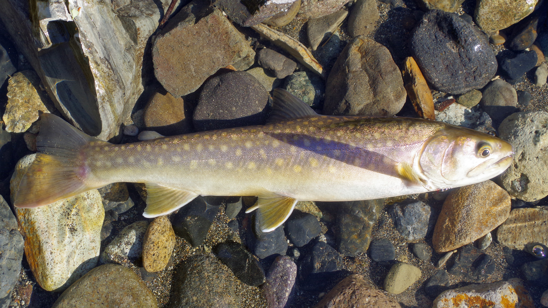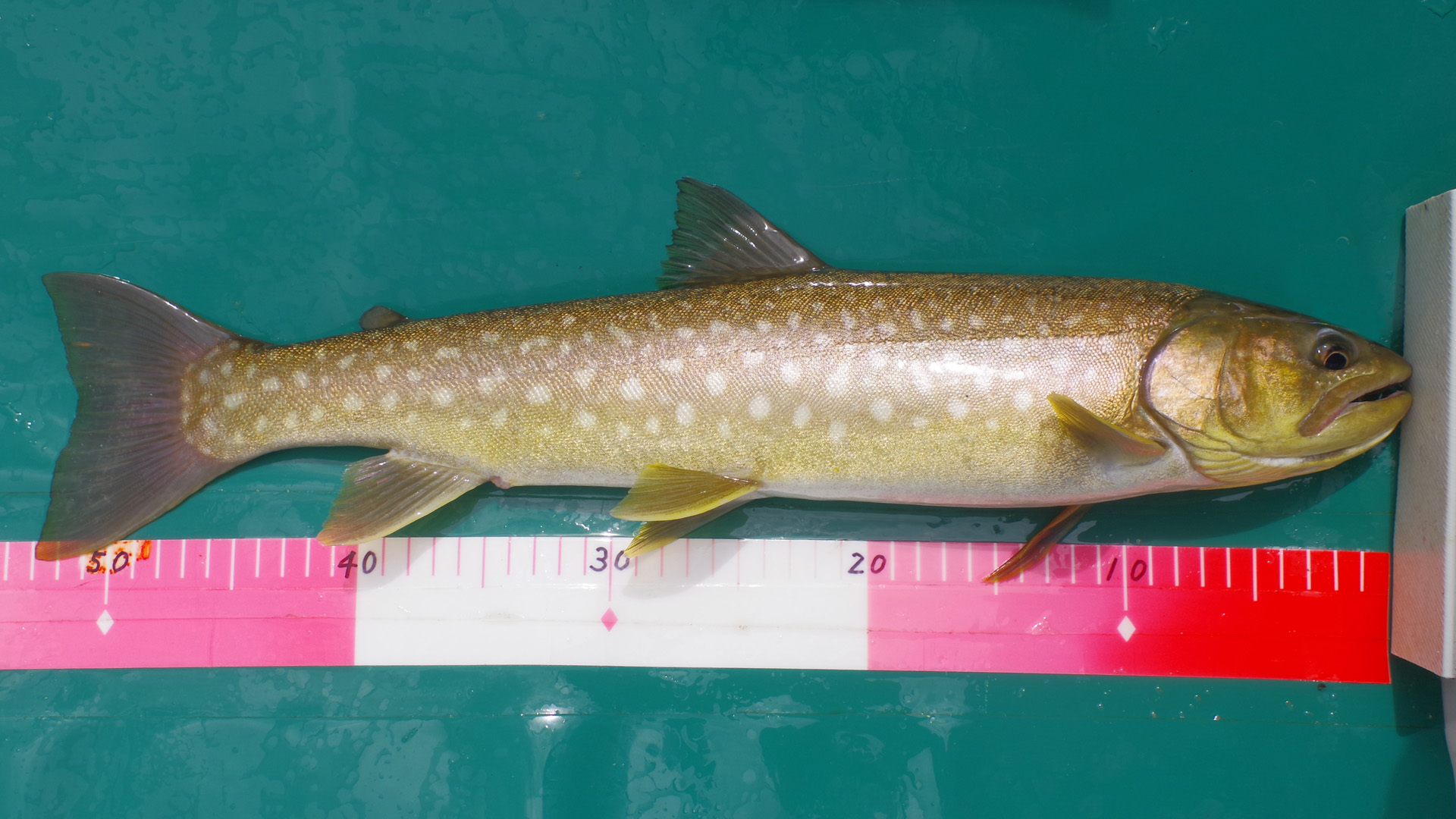 この日の表層水温は19℃ほどで、あと10日ほどで岸からの釣りも可能になりそうな気配でした。ただ、この日はまだ泳層が深く、10〜15m付近に魚影が見えていました。そのため、潜行板の中サイズでいつも通りのレイクトローリングとしましたが、これがなんとも反応が鈍く、苦戦させられました。しかも、午前10時ころまでは風が強く、ボートが波で翻弄されて釣りにならず、諦めて撤収しようかと思ったくらいです。それでも11時ころになると、予報通りに風も治まり、良いお天気の下、たまに出る魚信を楽しむ事ができました。この日の釣果は、金アメマス53cmまで8尾だけで、普段の半分以下。そして、久しぶりにニジマスボウズを喰らってしまいました。