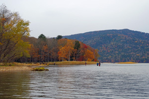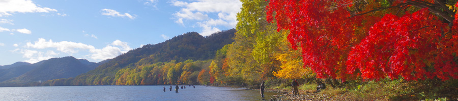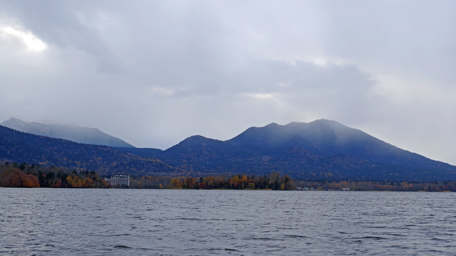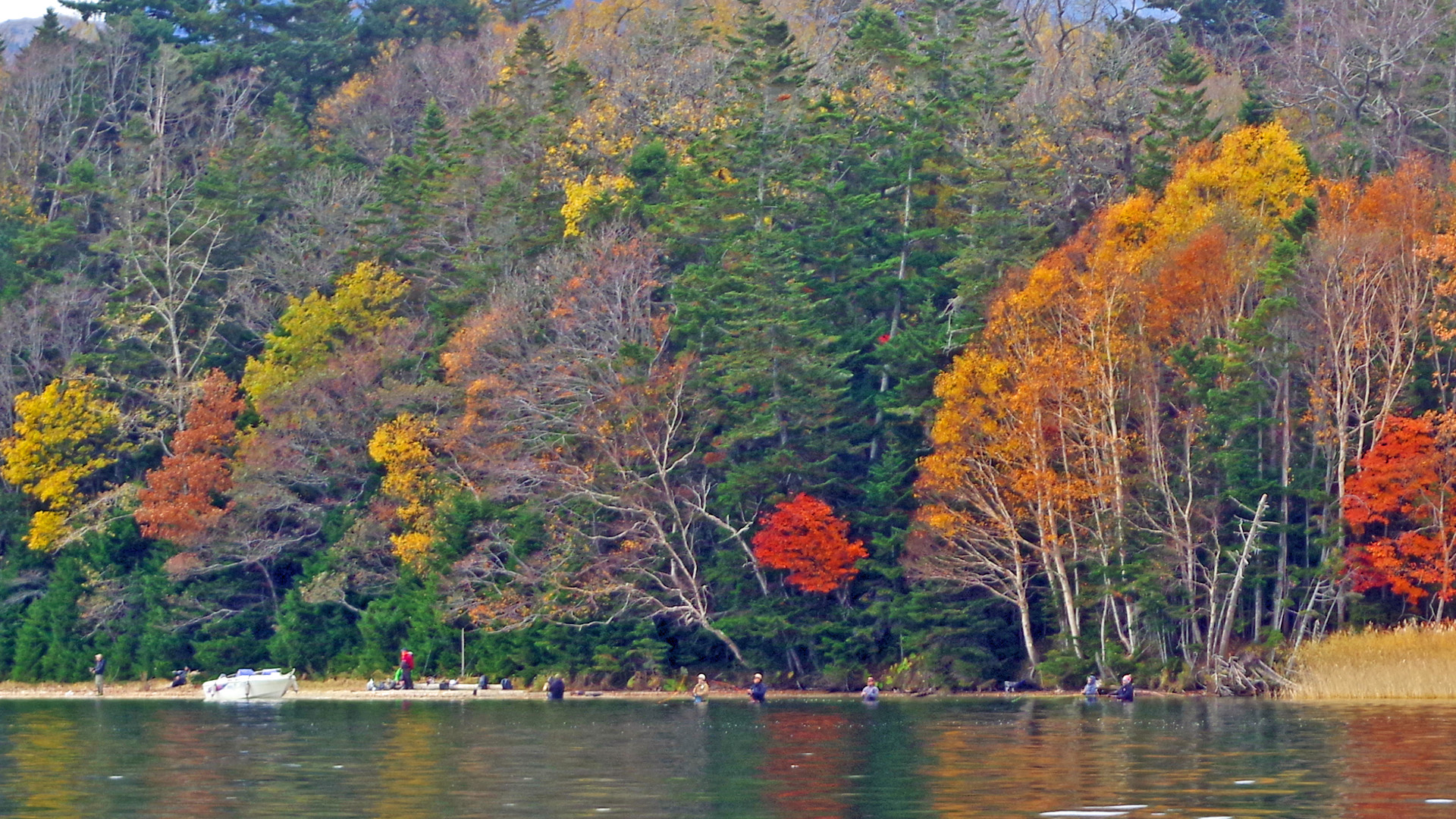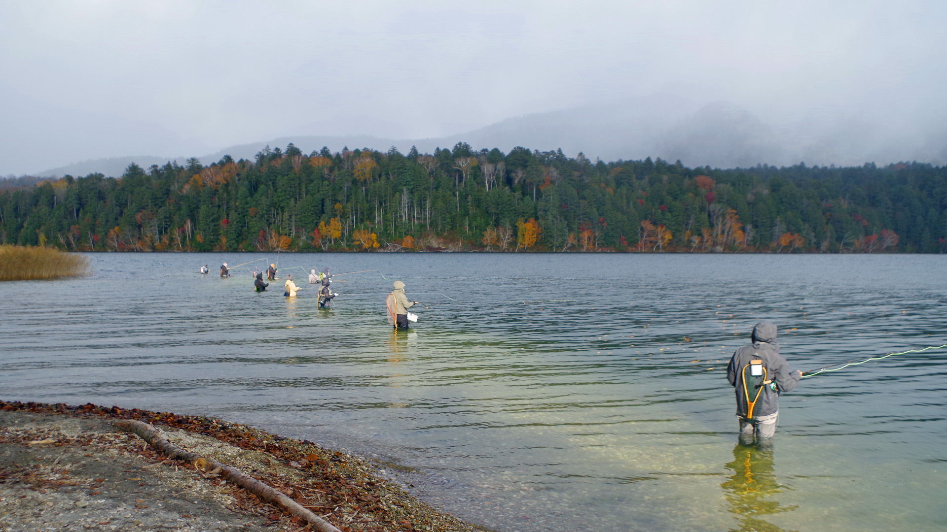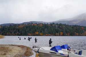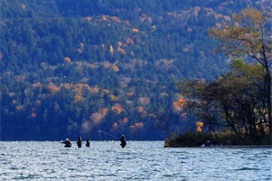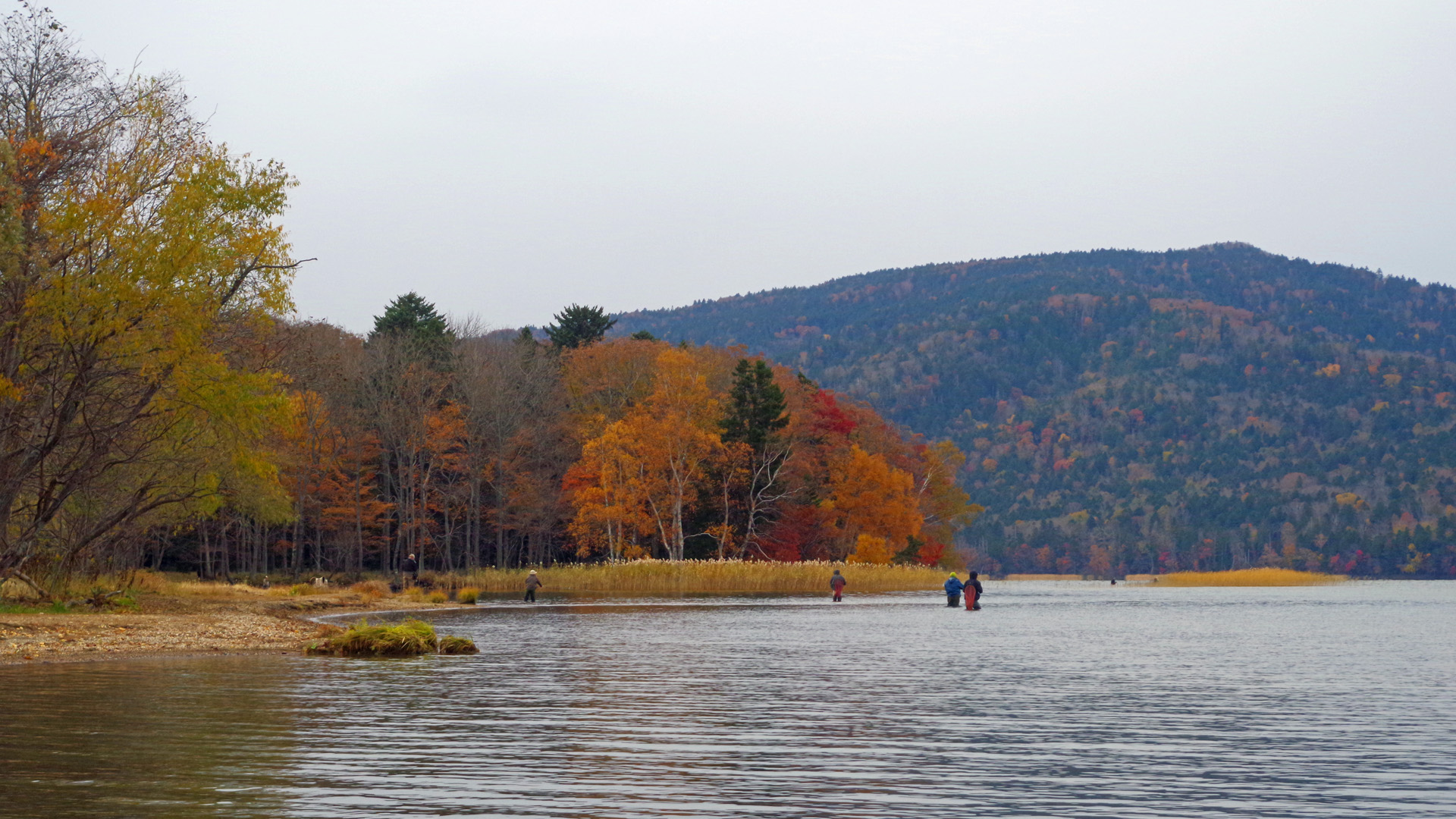 10月も下旬となりました。寒波の訪れることも多くなり、気温も急降下しつつあります。道北や峠道では、早くも降雪の便りが聞かれ始めています。道東方面の紅葉は最盛期を迎えていますが、季節の移ろいは早く、ほどなく枯葉の季節を迎える事となります。屈斜路湖などではチップ(ヒメマス)釣りの最盛期です。阿寒湖では、産卵を終えた細い魚体のアメマスが中心となってきています。渓では釣り人の少なくなるこの時期からが、大物ニジマスを狙えるチャンスの季節となります。今年も残り数週間となった北海道遠征釣行を、心残りの無い様に過ごしたいと考えています。(下写真は、紅葉とチップ釣りで賑わう屈斜路湖) ![]() ![]() 【10月21日(火)恋の季節のチップなら寒波でも釣れる】 前々日午後から11月末なみの強烈な寒波が入っていて、デリケートなニジマスは勿論、アメマスやブラウンさえも釣れそうにありません。この時期、寒波でも釣れるお魚さんと言えば、チップ(陸封型ヒメマス/ベニザケ/ソッカイ)くらいです。チップ達は恋の季節に入っていて、恋ガタキを追い払うために、口を使っているからです。ただ、寒波が来ると活性はやはり下がるため、数は釣れなくなる様です。そんな訳で、今年2回目の屈斜路湖のチップ釣りに、またまた出かけてしまいました。ただ、天気予報がまた外れ、青空は遥か彼方。良い写真は殆ど撮れませんでした。