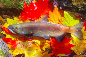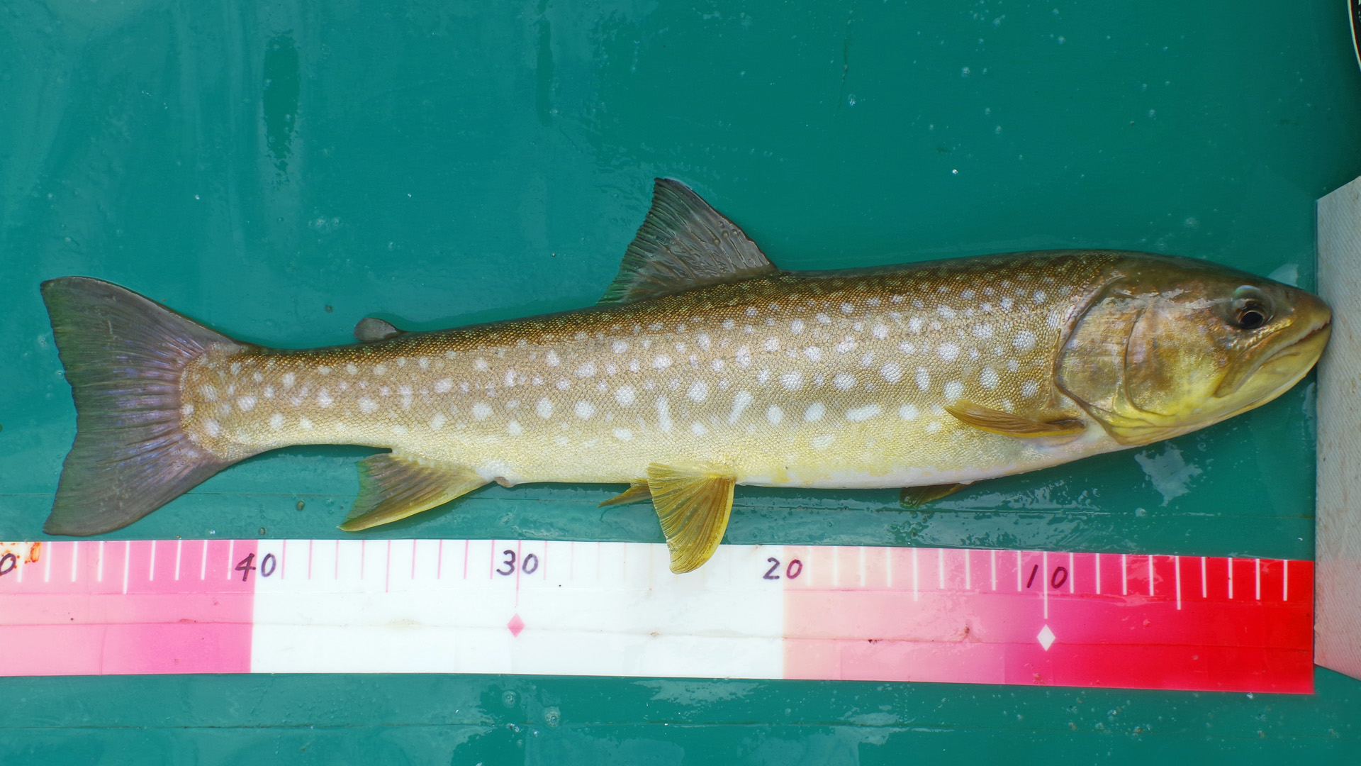 【使用タックル】 IL_Flusso/Tilf72、VanfordC3000HG、SiglonPEx8(35lb/2号)+GrandMaxFx2.5号、 Sukari50ssDeep/OB鮎、Ryuki50S匠/チャート、Bretton#2/金赤、他 【10月23日(木)寒波でも怯まぬ阿寒湖の大ニジマス】 前日は一時的に寒波が緩んでラッキーだった様ですが、依然として寒波は居座っていて、この日の朝の阿寒湖畔はマイナス2℃でした。渓では寒波は釣れなくなりますが、大きな湖ではそれほど影響はありません。寒波で行くところが無いため、寒いのを覚悟して阿寒湖へ向かいました。水温は既に12℃まで下がっていて、表層のハンドトローリングが楽しめます。8時半には出漁しましたが、まずは前回同様に、チップの産卵接岸を見に行きました。幸いにも、今回はブナ化したチップが2尾だけ確認できました。温暖化のせいか、チップの数は減っている様ですが、未だ健在の様で安心しました。