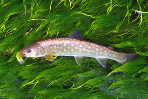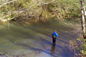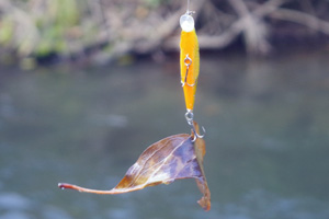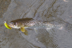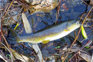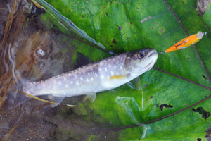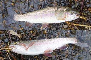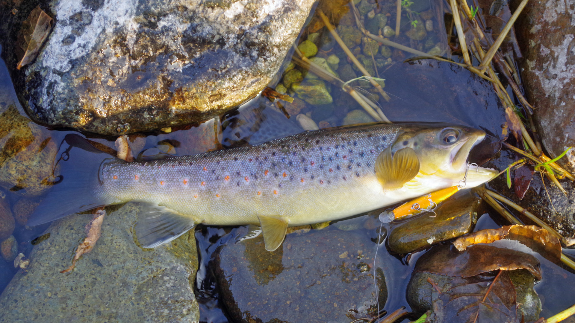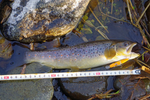 もう15時を回ってからの入渓でしたが、上左写真の様な細い流れで、尺足らずのブラウンが元気良く喰い付いてきてくれました。しばらく進むと、上右写真の堰堤が現れ、その落ち込みの深みに、お魚さんたちが溜まっていました。最初は何の反応も無かったのですが、どうも深さが2m近くもある様で、ミノーを底まで落として踊らせると、尺までのブラウンやニジマスが、このポイントだけで4尾ほどヒットしてきました。ニジマスはデリケートで寒波が来るとピタリと釣れなくなりますが、ブラウンやアメマスなら多少は釣れると言うことの様です。