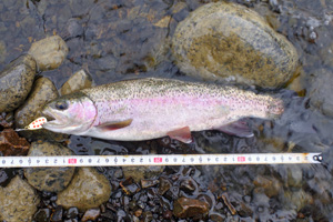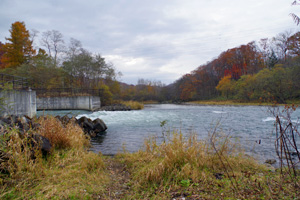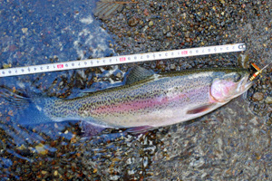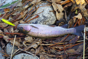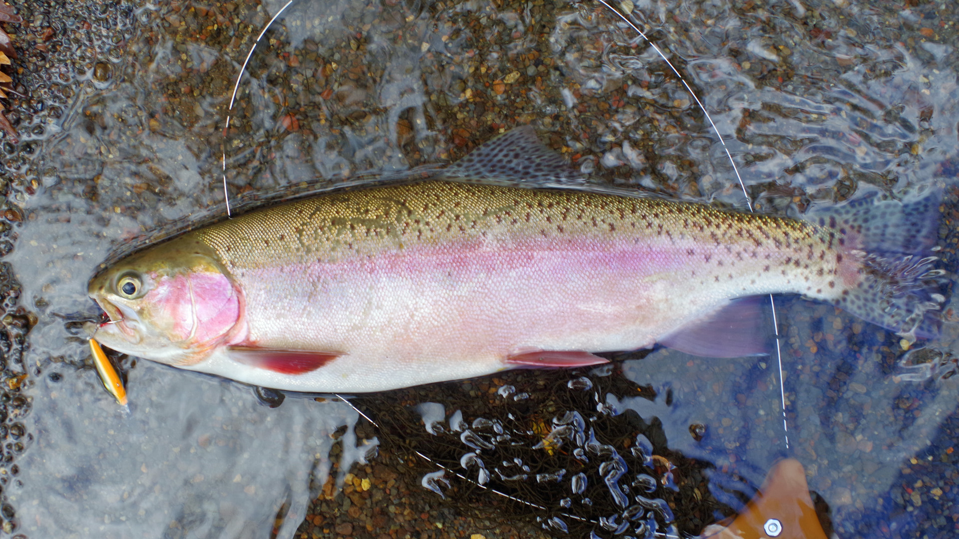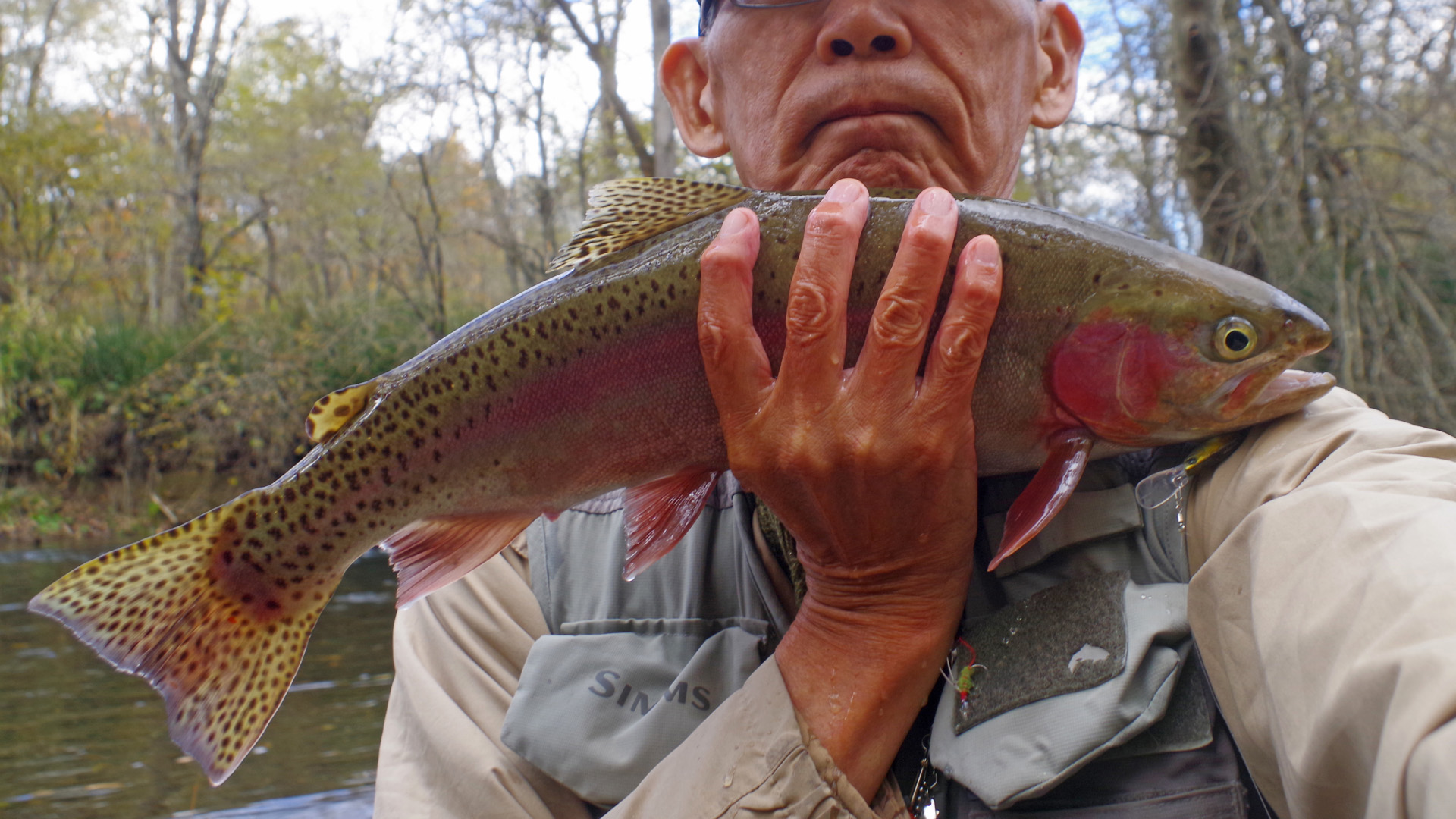 それでも下流側へ移動しながらスピナーを投げ続けていると、34cmほどの元気なニジマス君が飛び出してくれました。結局、この34cmが最大で、ニジマスばかり5尾の釣果を楽しめました。その後は9月末に巨大なイトウを大バラシした別の放水口のポイントを釣ってみましたが、今回もイトウの魚信は全く有りませんでした。やはり、昨年から前回まで、3回連続でイトウがヒットしてきたのは、単なるラッキーだったのでしょうか。ただ、今年はもう無理ですが、また来年にチャンスがあれば、リベンジしてみたいと思っています。