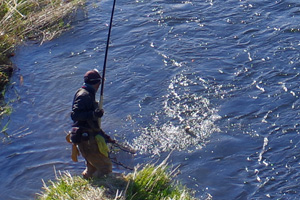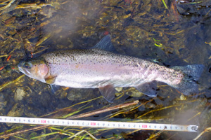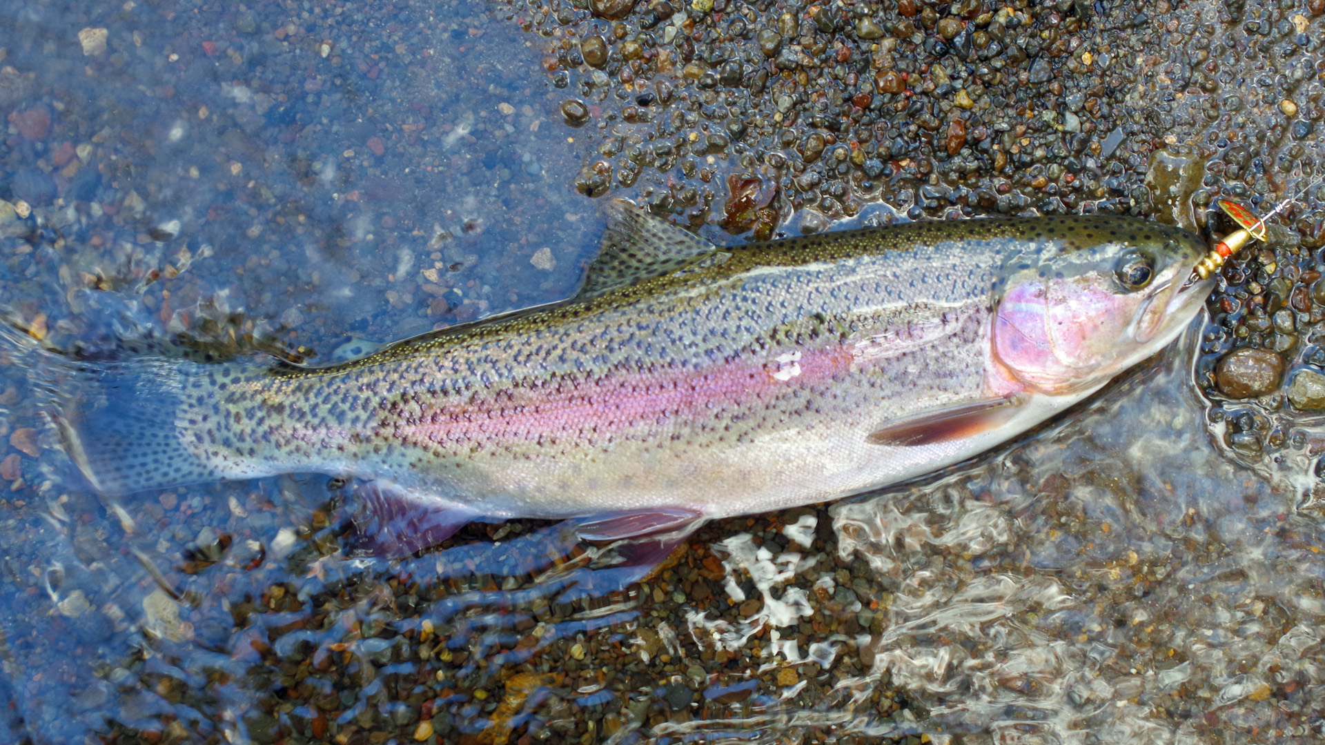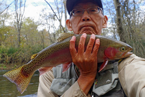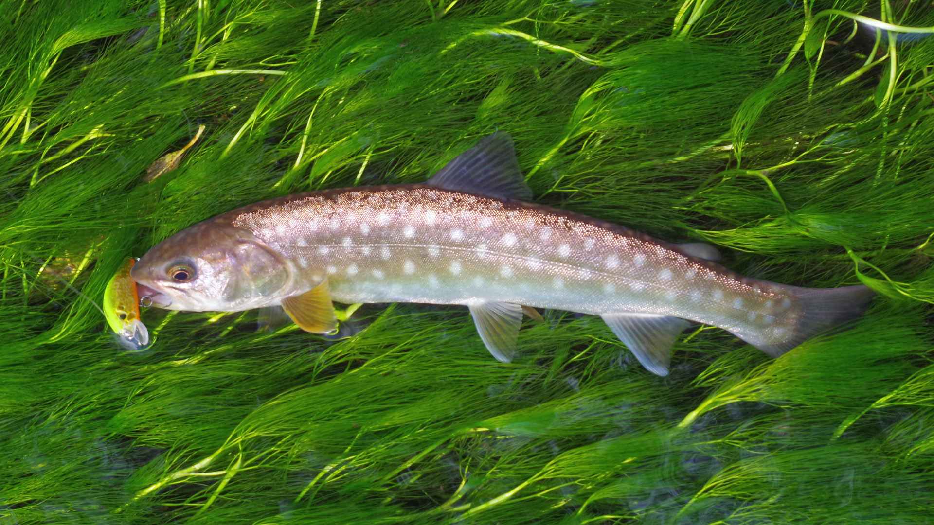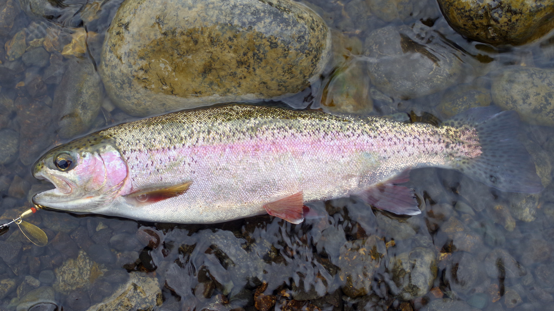 それでも下流側へ移動しながらスピナーを投げ続けていると、34cmほどの元気なニジマス君が飛び出してくれました。結局、この34cmが最大で、ニジマスばかり5尾の釣果を楽しめました。その後は9月末に巨大なイトウを大バラシした別の放水口のポイントを釣ってみましたが、今回もイトウの魚信は全く有りませんでした。やはり、昨年から前回まで、3回連続でイトウがヒットしてきたのは、単なるラッキーだったのでしょうか。ただ、今年はもう無理ですが、また来年にチャンスがあれば、リベンジしてみたいと思っています。