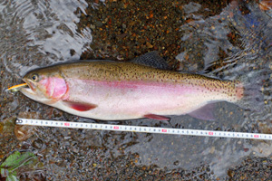 のんびりと釣り場に到着したのは、もう10時過ぎでした。ただ、同じ様に考える人は多い様で、平日にも関わらず、橋のたもとには何台かの車が停まっていて、釣り人も何人か見られました。しかし、私のお気に入りのポイントは人の入りたがらない藪の中。構わず入渓すると、11時前になり37cmのニジマスがヒット。その後もアメマスのおチビちゃんが続き、そして11時20分ころでした。いつもの深みにいつものミノーを投げ込むと、いつもの様にお魚さんが出てきてくれました。今年13尾目の大ニジマス51cmでした。それにしても、また50cmチョイ。なんなんでしょうね。