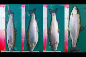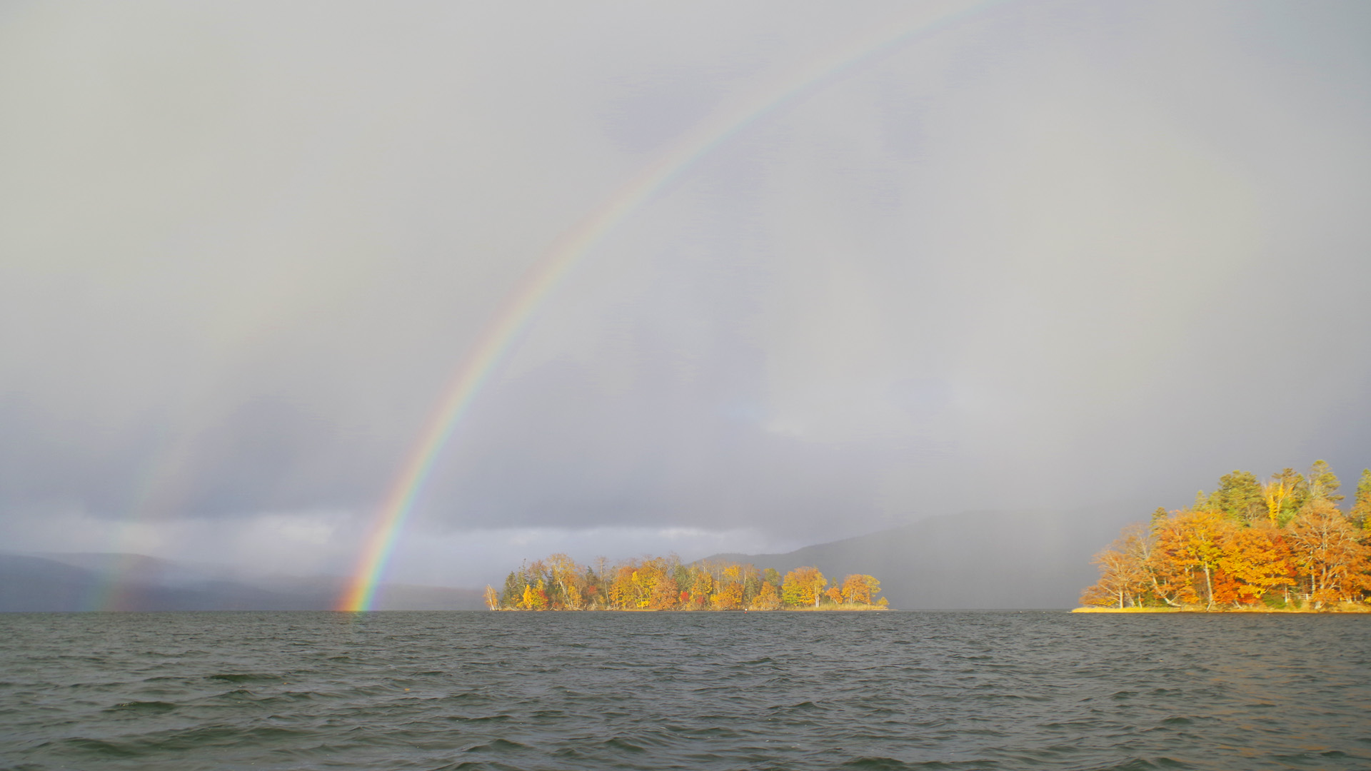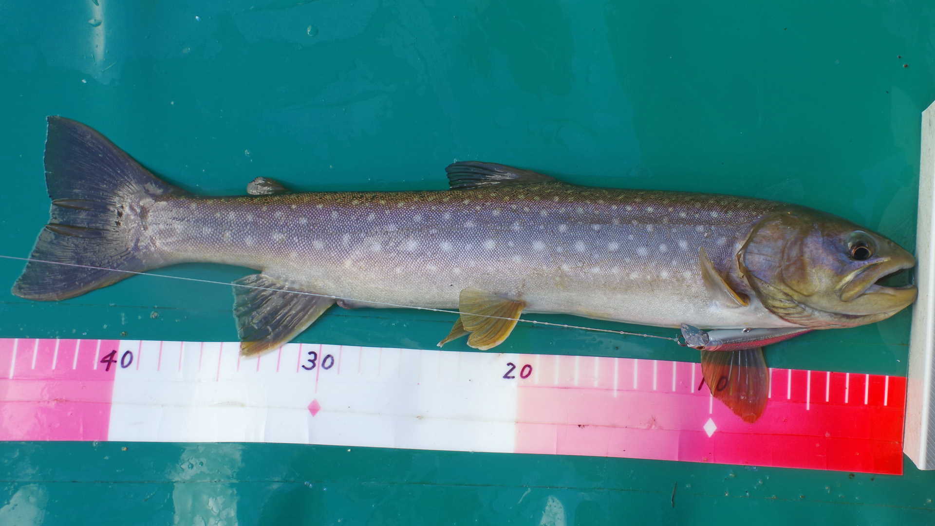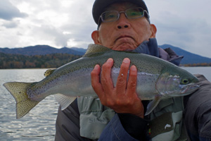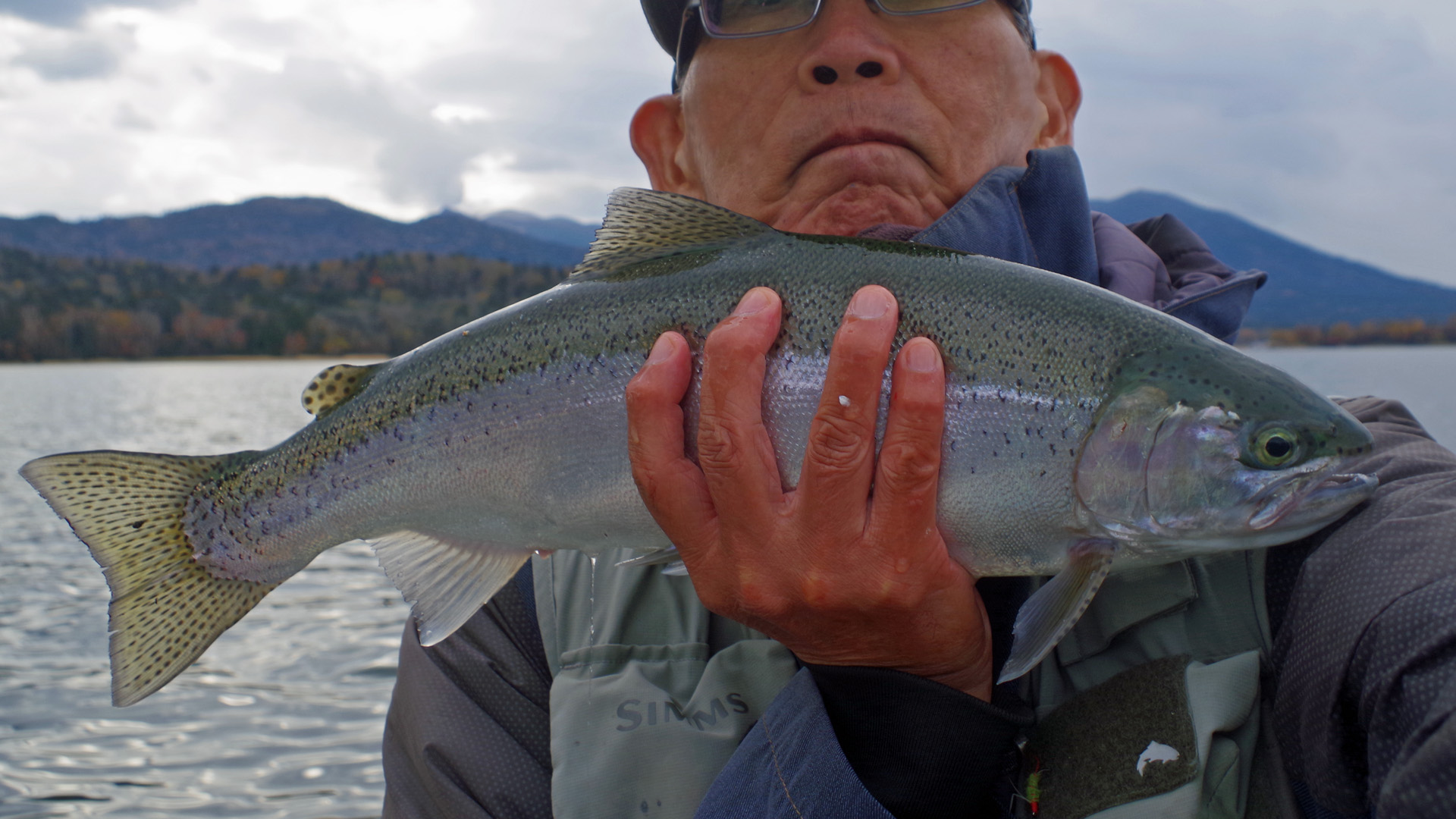 ただ、大ニジマスを釣った後しばらくして、なにやら冷たい風が吹き始め、ブルブルと震える寒さになってしまいました。見ると雌阿寒岳方面で雪が舞っている様子。寒気にそれほど影響されない湖のニジマスでも、流石にこれでは釣れなくなりそうなため、早めの15時には納竿としました。しかしなんですね、今年は既に50cm超えの大ニジマスを14尾も釣っていますが、なぜか大半が50〜53cmのギリギリサイズ。この日は5尾もニジマスが釣れているのに、やはり50cmチョイの微妙なサイズ。今年は一体、どうなってんでしょうね。