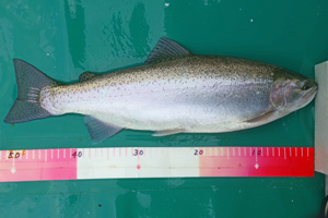 この日は平日にも関わらず、岸釣り師の数が尋常ではありませんでした。大島には杉坂プロのご兄弟がツアーで来られていたそうで、ワカサギの撒き餌をして65cmのモンスターニジマスを釣られたそうです。撒き餌の釣りは好きではありませんが、この時期は産卵でアメマスも殆ど釣れないため、お客さんに釣らせるためには仕方ないのでしょうね。さて、私の釣りの方ですが、これまでニジマスは日に2尾までしか釣れて無かったのですが、この日はなんと5尾も釣れてしまいました。しかも、10:45時に38cm、11:05時に39cm、11:40時に40cm、13:10時に42cmと、時間とともに型が良くなり、14:20時にはついに52cmの大ニジマスが釣れてしまいました。こんな事は初めてです。