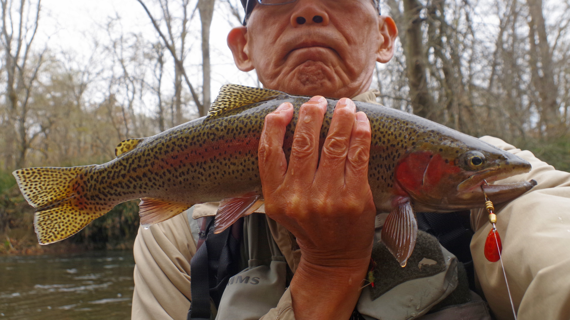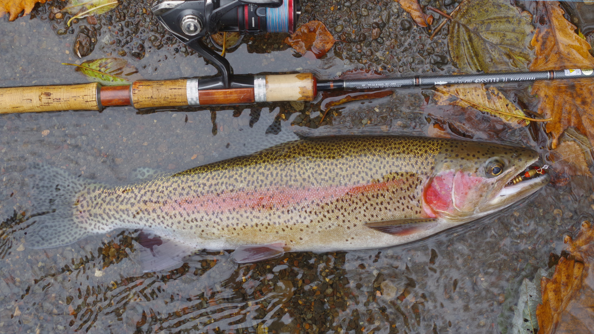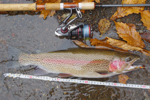 深い淵ではディープダイバー、浅いポイントではスピナーなどと使い分けていますが、この日は浅い所でもすぐに反応があり、珍しくブレットンに良型がヒット。ただ、スピナーはバレやすく、大型のニジマスはまず逃げられてしまうのですが、このニジマス君は唇の一番奥にしっかりフッキングしてくれ、なんとか取り込めました。ただ、サイズを測ってみて少々ガッカリでした。あと5mmか1cmほど足りない、泣き大ニジマスでした。でもま、時間も無いのに良くヒットしてくれたと感謝して、早々に納竿としました。それにしても、渓はもうすっかり冬支度です。光陰矢の如しです。