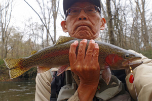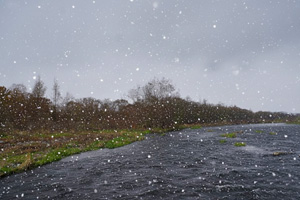 早速、1つ目のポイントでスピナーを投げまくりましたが、これが全く反応がありません。まるで魚が居ないかの様子。仕方なく、ポイントを移動して、今度は超久しぶりにフライロッドを取り出しました。しかし、こちらのポイントでも反応は全くありません。そのうち、上右写真の流れの殆ど無い淀みにフライを投げ込むと、ようやく魚信が出て、下左写真の37cmがヒット。この1尾までに実に2時間が経過していました。普段からそうですが、こんな寒波の入っている様な日でも、餌釣りだけは釣れちゃうんですね。その後は雪が舞ってきたため、退散しました。