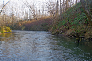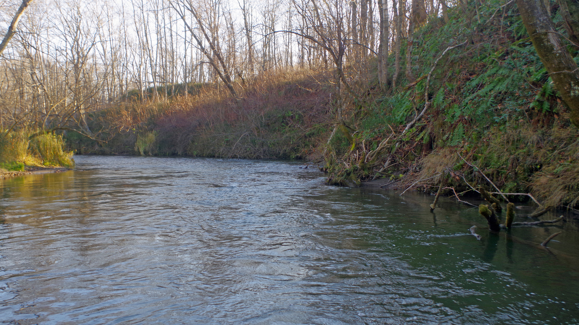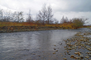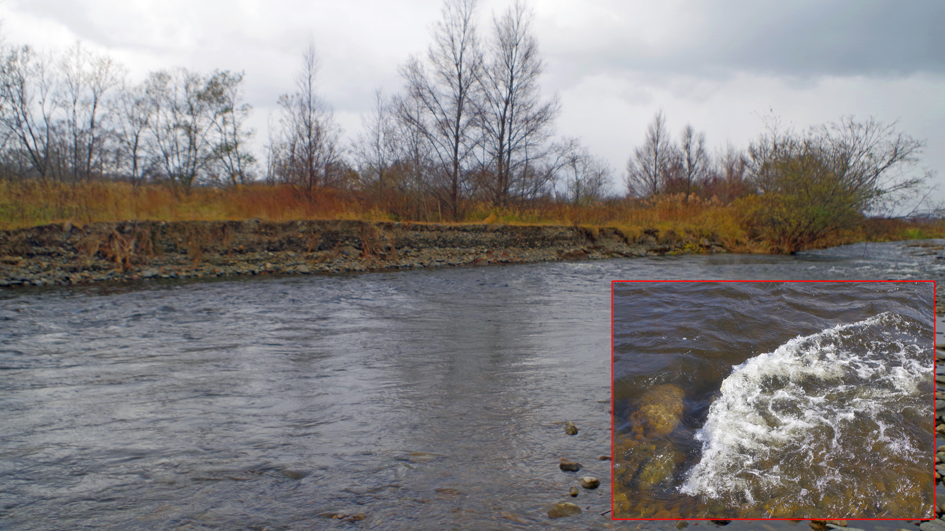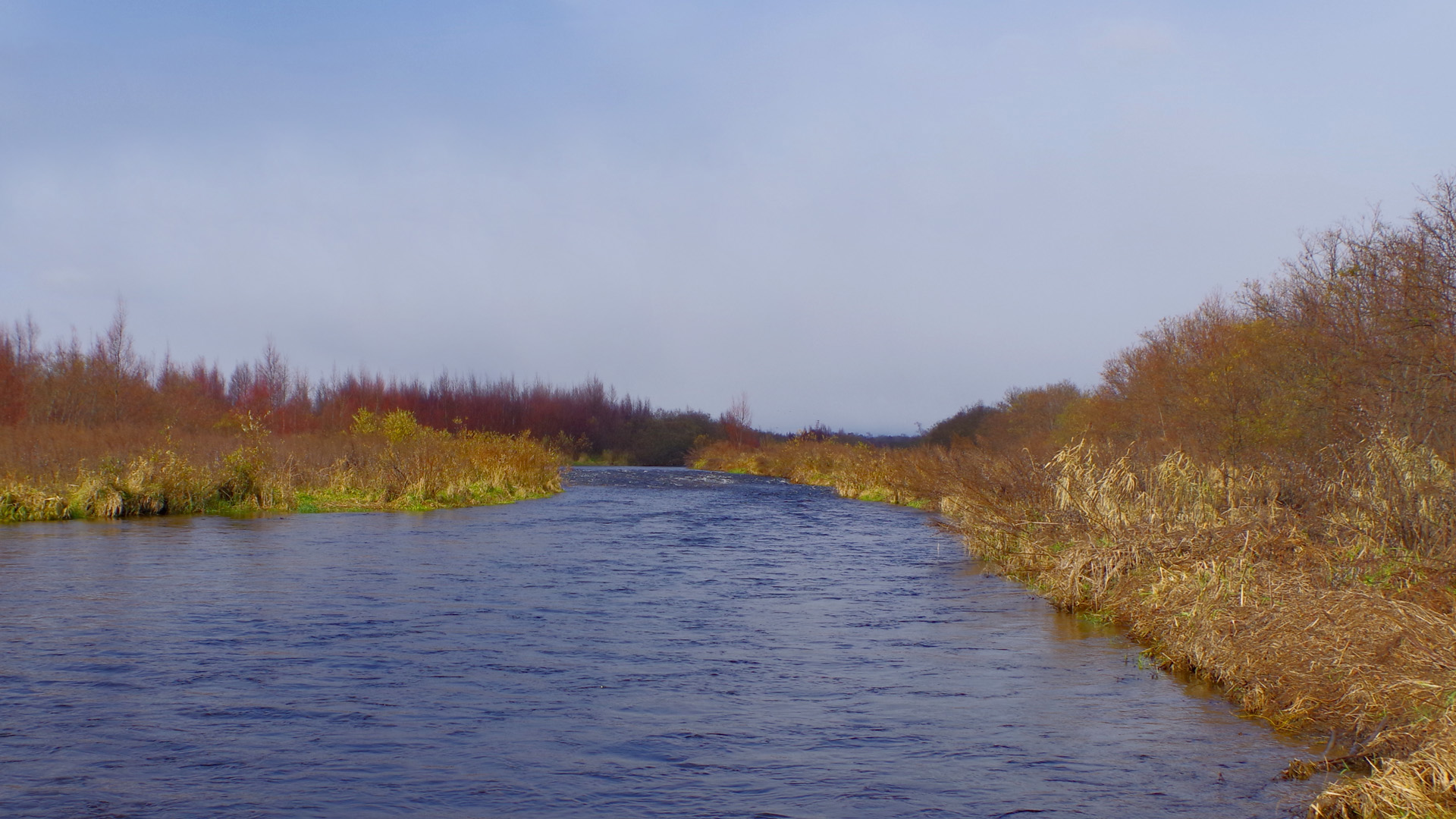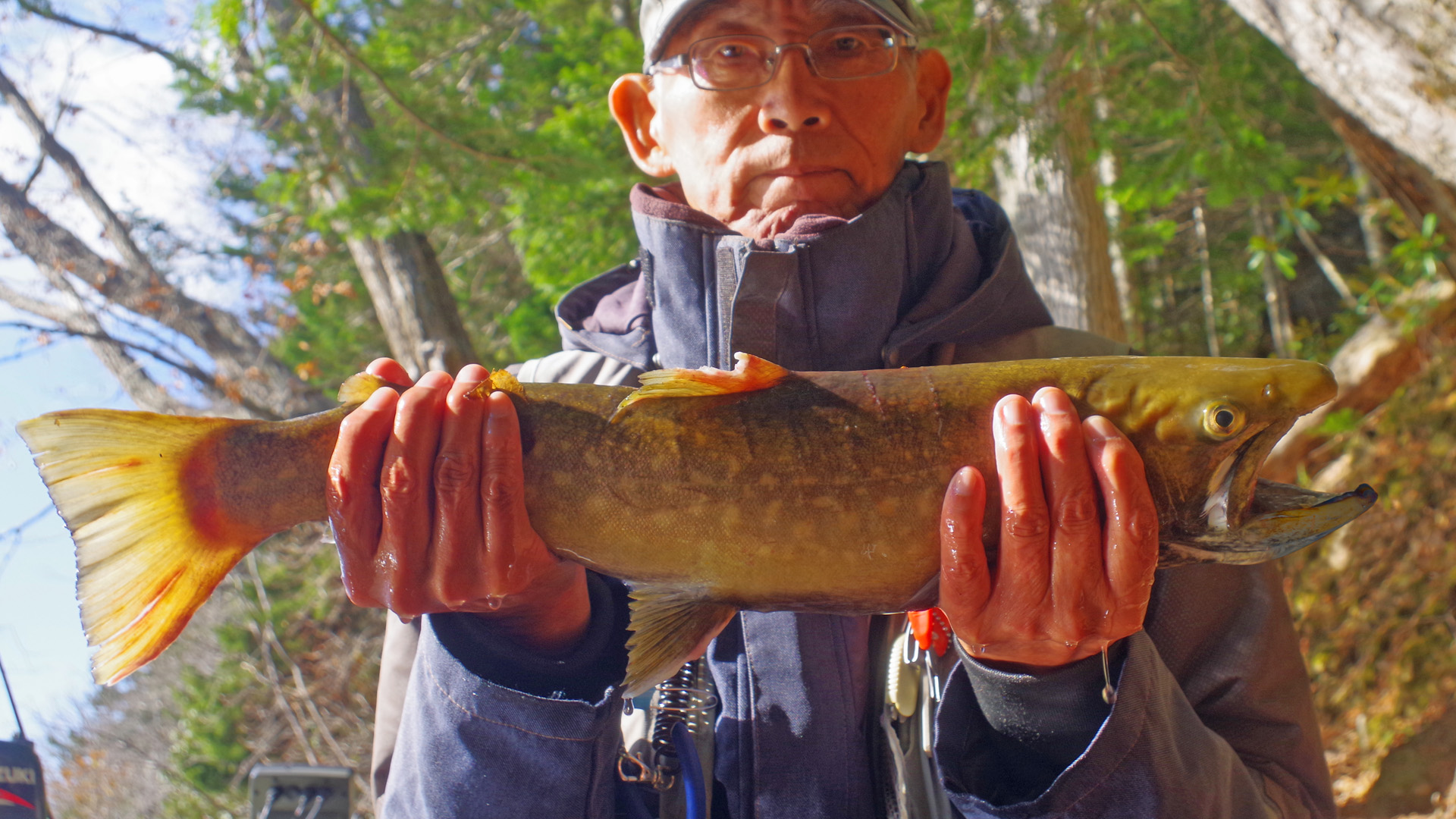 【使用タックル】 CarddiffNX/S83ML、VanquishC3000、SiglonPEx8(35lb/2号)+Nanodax17.5lb、 D-Contact72S/ワカサギ(SBL)、Sukari60deep/Rグリーン(SBL)、他 【11月7日(金)道東最終日のホームの渓は有終の美】 この日はお昼頃から寒波が入り、10時頃をピークに急激に気温が下がるとの予報でした。そのため、普段はのんびりと入渓する事の多い私ですが、珍しく9時前には釣り場に立っていました。付近には釣り人の姿も見えましたが、流石に11月に入るとその数は少ない様です。釣り場に到着すると、いつものポイントに通じる道の入口には、大きな木が倒れ込んでいて通れず、しかも足跡も全く無く、どうやらこの付近には、11月1日の暴風・豪雨の後は誰も入渓していない様子。藪漕ぎをして入渓すると、上流で雨が降っていたのか、薄く茶色い濁りが入っていました。