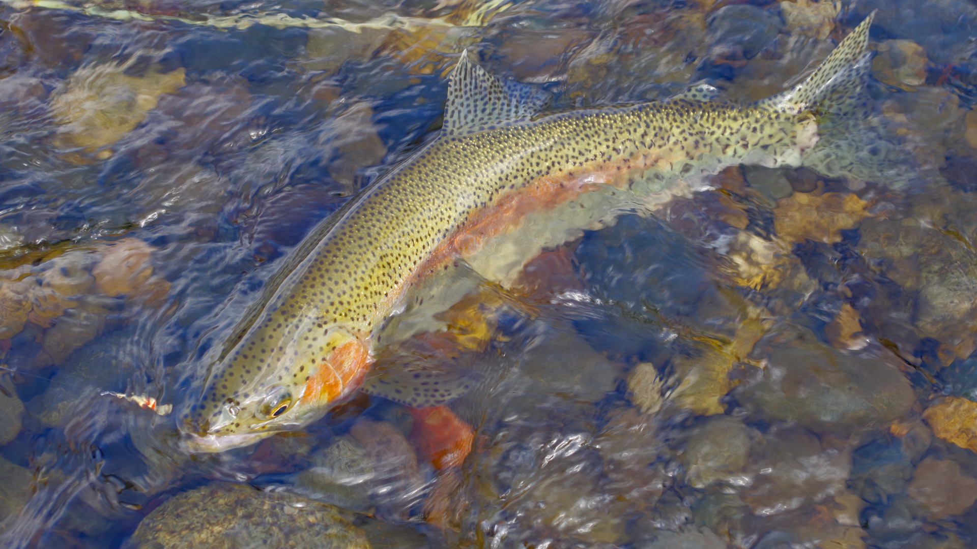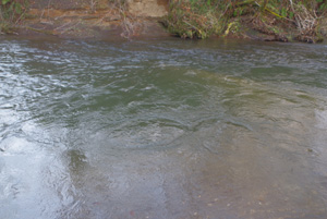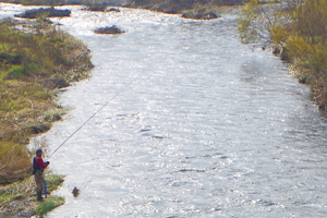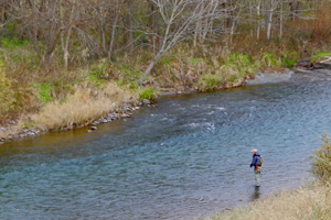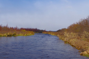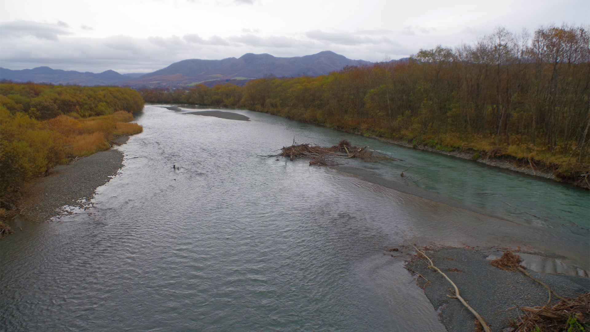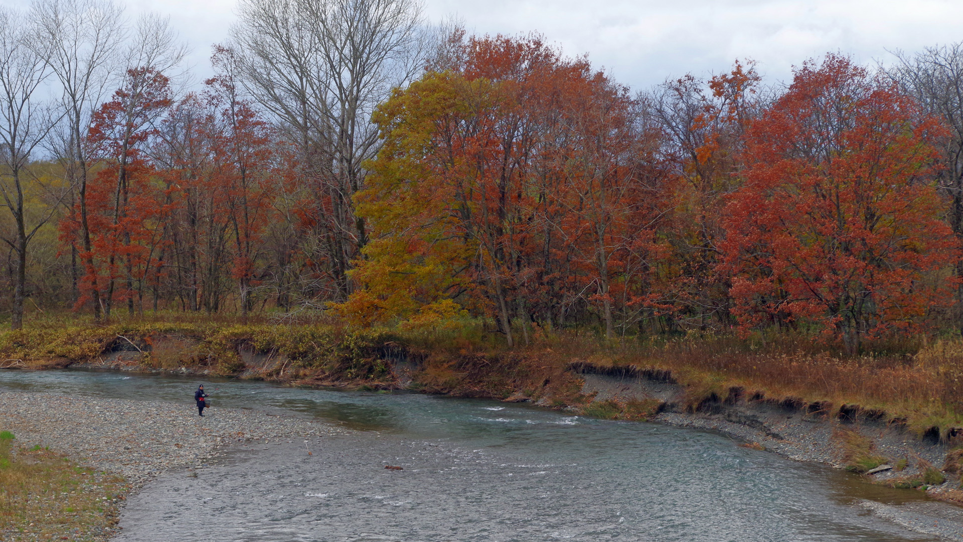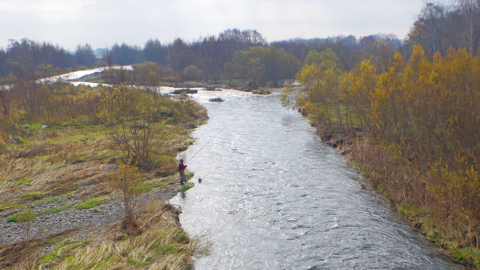 11月になりました。今年の冬の到来は早く、釣りに最適な秋の季節もあっと言う間に過ぎ去りました。道内のほぼ全域で初雪が観測済となっていて、釣り人たちも冬の準備に余念が無い様です。アメマスやオショロコマの産卵は、ほぼ終わった頃ですが、月初には季節外れの暴風豪雨が吹き荒れたため、稚魚たちの生育の状況が心配です。一方で、これから結氷するまでの時期は、餌が少なくなる事に加え、釣り人も激減することから、超大物のチャンスとなる季節でもあります。そんな中、残り僅かとなった北海道を、後ろ髪を引かれる思いで楽しんでいます。 (下写真は、紅葉の十勝から望む冠雪の日高山脈) ![]() ![]() 【11月4日(火)豪雨後3日目で寒波が緩むとニジマスも動く】 11月1日に台風並みの低気圧が道南岸を通過し、道東では100mm前後の豪雨となりました。そのため、本流の釣り場はどこも泥濁りとなり、この日も未だ釣りにならない渓が沢山ありました。こういう時の神頼みは、源流か湖か湧水の渓となります。源流ではまだオショロコマは産卵で釣れず、湖は風が強そうなのでダメ。仕方なく、またまた別海の湧水の渓へ向かいました。と或る橋の上から見ると既に足跡だらけで、前日までの3連休で、相当な釣り人が入っていたようです。でもま、この日は平日で先行者はいないであろうと、気にせず入渓。