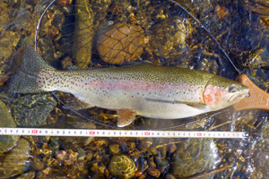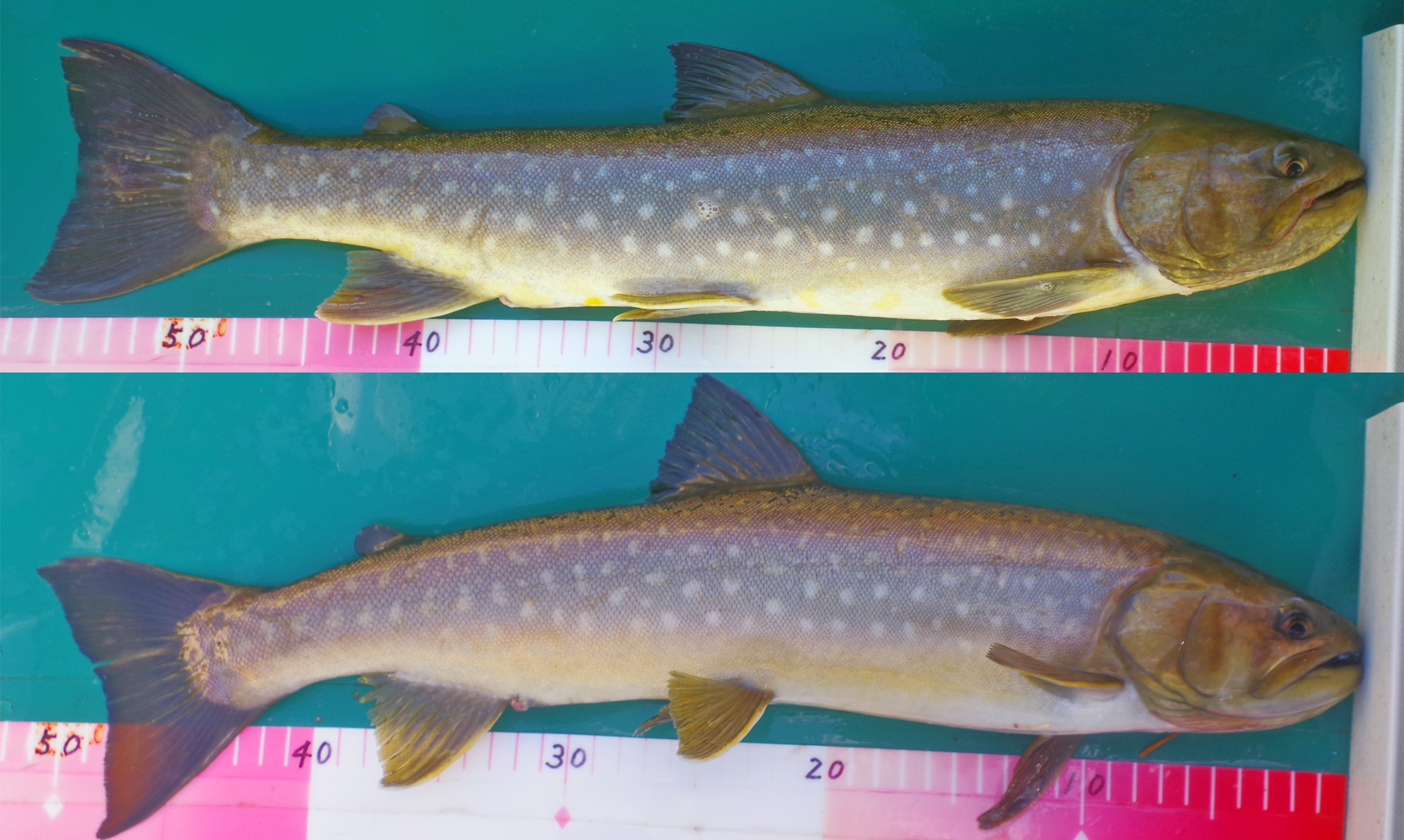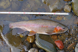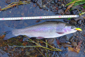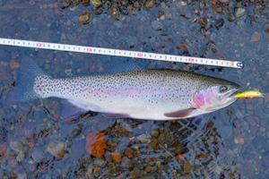 そして釣り始めると、しばらくは全く魚信がありません。ところが9時半過ぎ、なんでも無い様な瀬で突然、強い魚信が出て、右上写真のとても綺麗なニジマス45cmがヒット。その後もおチビちゃんを挟んで、今度は10時半過ぎ、先ほどのニジマスとそっくりで全く同サイズの45cmがまたヒット。写真で確認すると、まるで双子の様なニジマス達であり、ビックリ。今年はホームの渓には20回ほども入渓していますが、ダム下の本流では、8月にマグレで52cm、9月に45cmが出た以外は、ロクな釣果が無かったため、この良型2尾の連発には驚かされました。