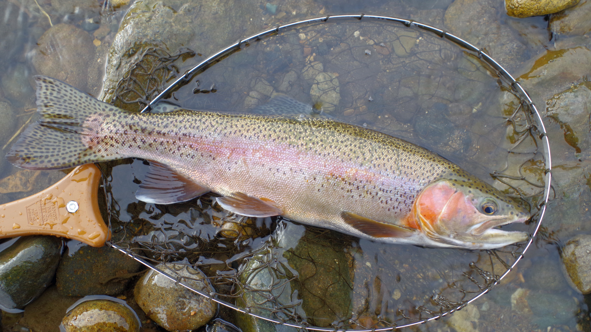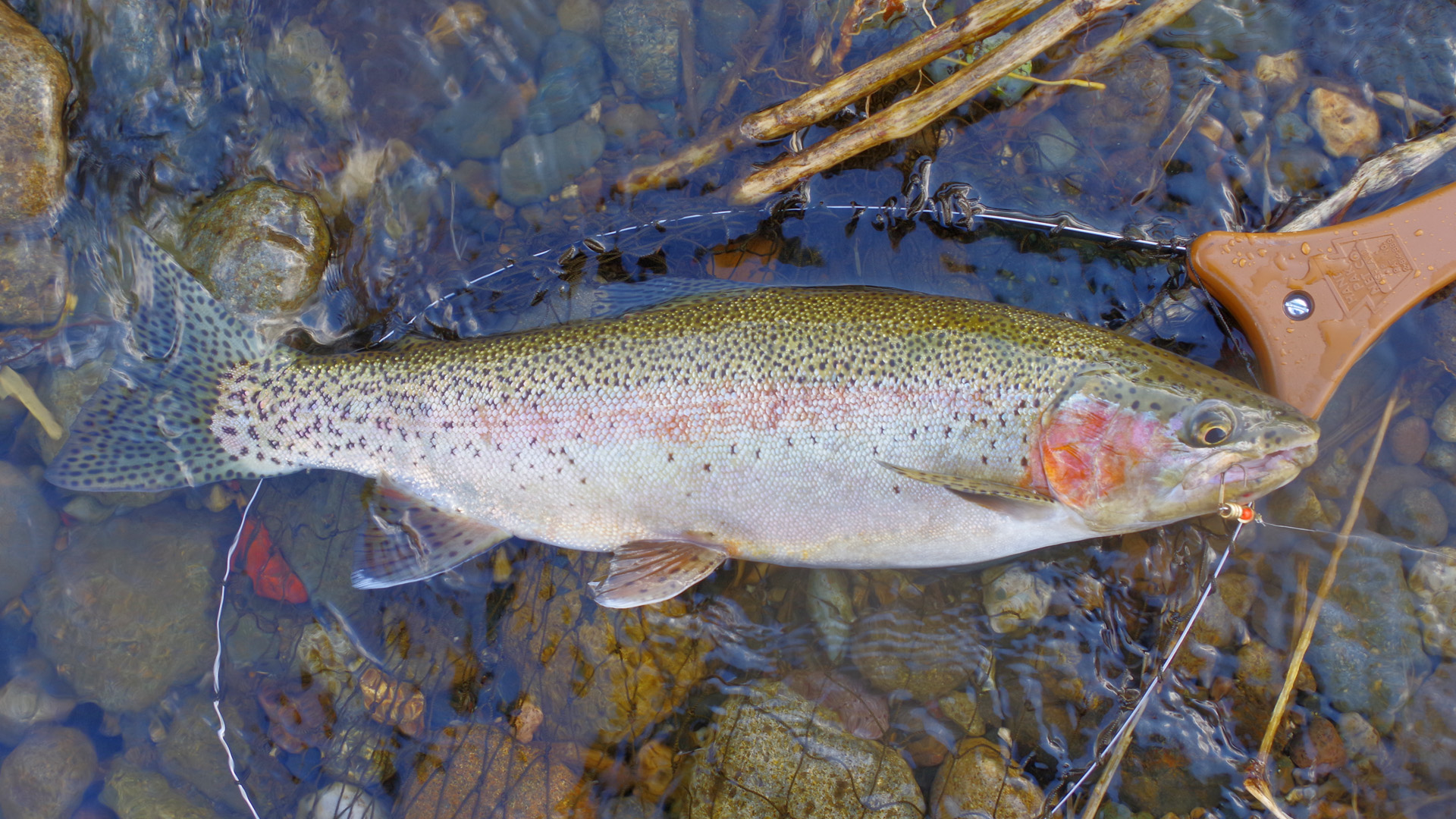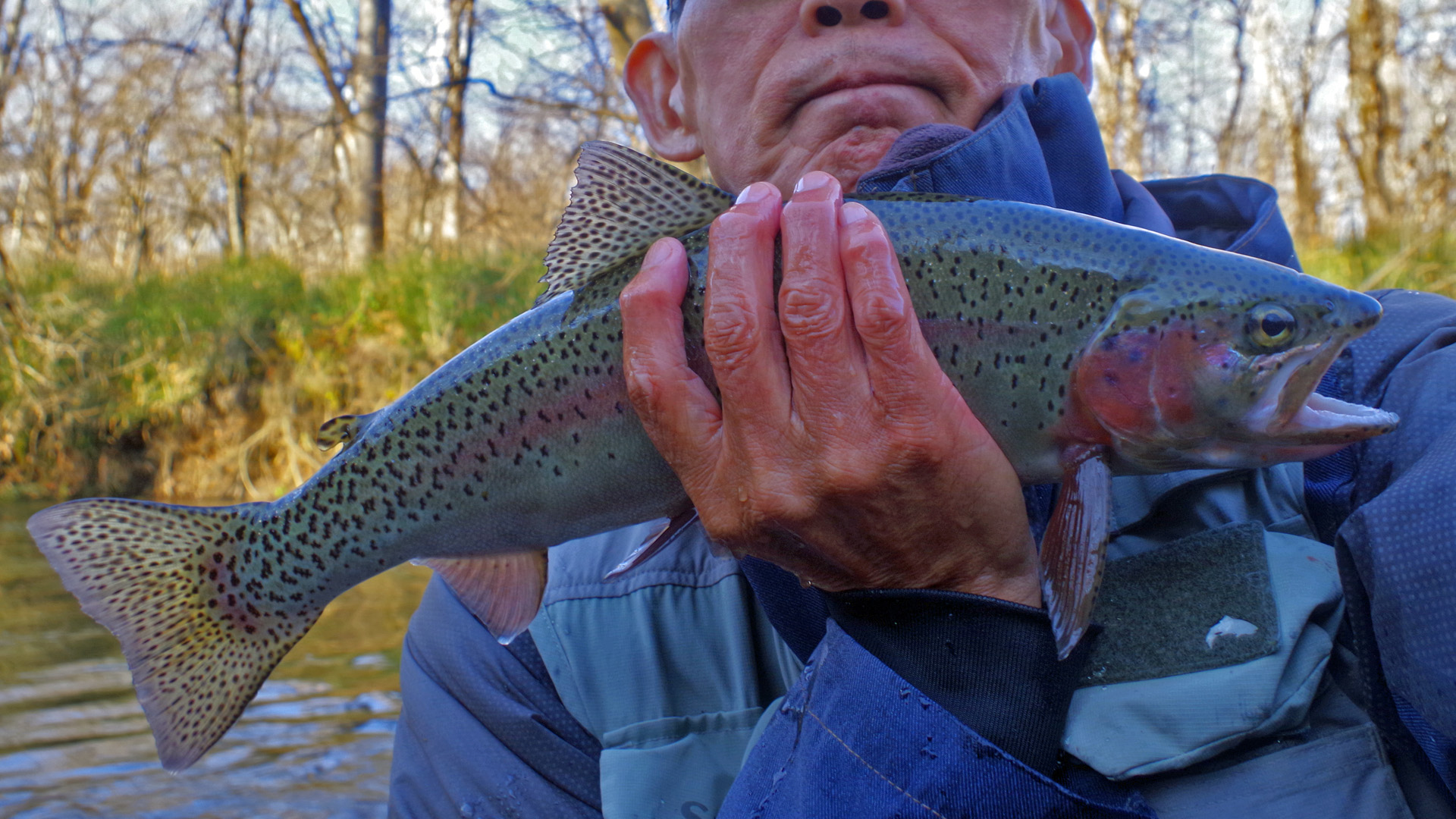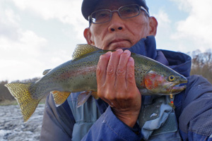 ただ、湧水の渓は豪雨の影響がそれほど無かったのか、渓水は意外とクリアでした。そして、いつもの様に釣り始めると、まずはおチビちゃんがヒット。その後すぐに写真右上の45cmがヒット。寒波が抜けて前日より5℃ほども気温が上がったためか、活性はまずまずの様子。更に釣り下がって20分ほどすると、今度は左下のジャスト40cmもヒット。ただ、前日までに相当に叩かれたためか、この日は大ニジマス君は出て来てはくれませんでした。十勝のホームの本流では、40cmに満たない小物ばかりですが、湧水の渓は良型・大型の魚影が濃く、今年は助けられました。