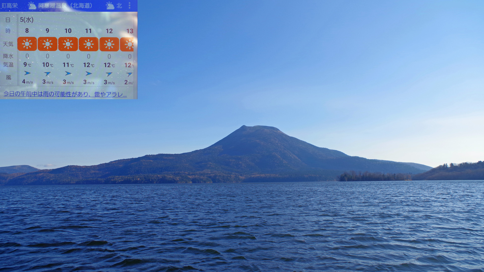 【使用タックル】 IL_Flusso/Tilf72、VanfordC3000HG、SiglonPEx8(35lb/2号)+GrandMaxFx2.5号、 Ryuki50S匠/ゴールドヤマメ、Sukari50SSdeep/OB鮎、Bretton#2/金赤、他 【11月5日(水)阿寒湖のニジマスチャンスも終りか】 10日ほど前の阿寒湖の興奮が忘れられず、今年最後のチャンスとばかりに再び阿寒湖に向かいました。この時期はミニボートでも出艇可能な風の弱い日が少なく、前日か早朝に予報を見て阿寒湖入りするのが常です。この日も早朝の予報では、午前中は風速0か1のほとんどベタ凪の予報でした。実際、現地に到着した時は、鏡面の様な湖面で予報通りでした。ところが、出艇して10分もしない内に、にわかに突風が吹き出し、予報を見ると、写真下中央の様に風速4に・・・こんな予報なら、通常は舟は出しません。またまた騙されました。4以上は危険なのです。