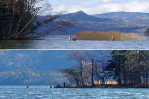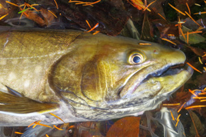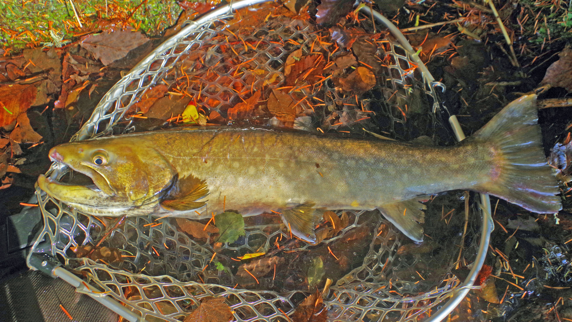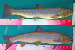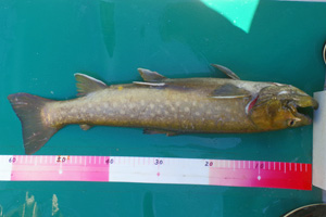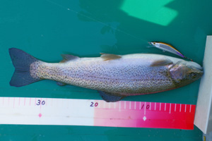 ヒヤヒヤもののやり取りの末、目の前に現れたのは61cmもある丸々と太った大アメマスでした。見ると魚体全体が傷だらけで、ファイト中にラインを巻きつけて大暴れした様です。下顎の突き出たツワモノで、実に素晴らしいファイトでした。その後は13時半過ぎになり、37cmほどの小ニジマスが釣れましたが、結局、大ニジマスとは巡り合えませんでした。ただ、岸釣りのフライマンには、何本かの大ニジマスが出ていたそうで、沖合を走るトローリングの季節は終わった様です。もっとも、フライマン達はワカサギの撒き餌をしており、そりゃ、釣れて当たり前ですよね。