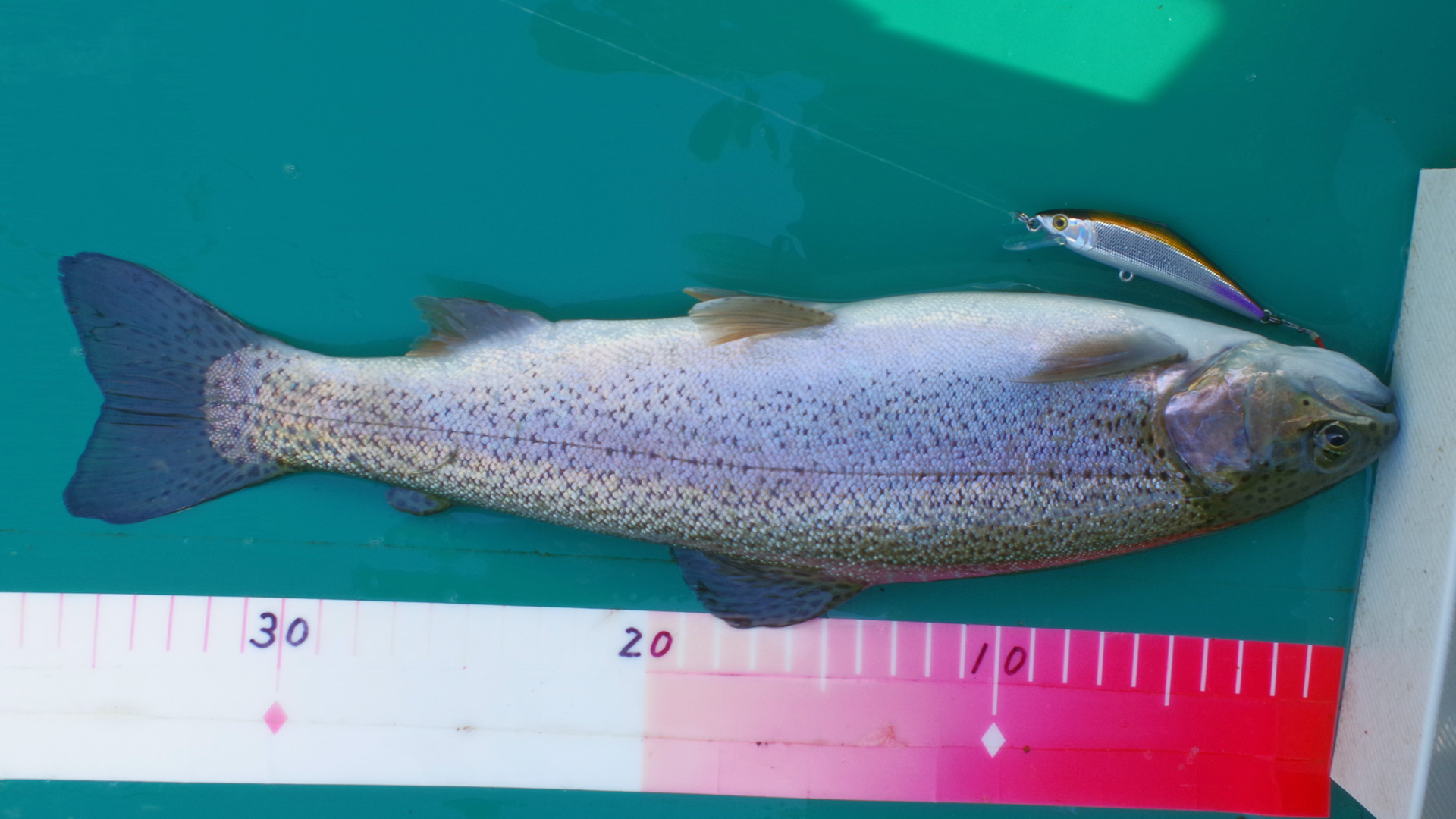 仕方なく、一旦は戻って待機&昼寝で波の収まるのを待ちます。そして11時前になり、ようやく出艇できました。ただ、この時期のニジマスの時合いは10〜12時頃が多く、既に時合いを逃した可能性もあります。それでも、出航するとすぐに37cmの小さなアメマスがヒット。その後は、なぜか51cm、57cmと大物が続きました。この時期にしては珍しい現象です。この時期は産卵後の痩せた中型のアメマスが多いのです。そして12時過ぎになり、今度はドラグを唸らせ、ラインが数十mも引き出される魚信が出て、「大ニジマス来た!」と大喜びしたのですが、・・・