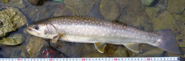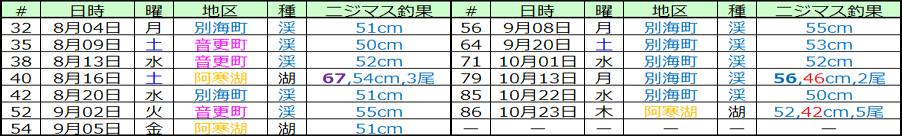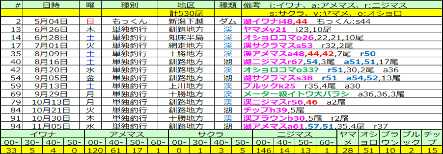 昨年夏の線状降水帯発生の影響か、新潟下越のダム湖では魚影が激減している様です。山形県内のダム湖で、2013年の集中豪雨後に渓魚の魚影が消えた事があり、同様の事態が下越でも起きた可能性が有ります。6月中旬になると、北海道では急激に気温が上昇し、6月17日に北海道入りしたものの、既に高水温で良い釣りができない状況でした。更に、7月は平年より+5℃という、史上最も暑くかつ大渇水の夏となり、ほとんど釣りにならない日々が続きました。 ただ、8月に入ると大気不安定による集中豪雨が頻発し、雨量としては大した事の無いものの、頻繁に良い濁りが出て、大ニジマスが連発し始めたのは幸いでした。10月に入ると、今度は一気に気温が下がり、秋らしい日が殆ど無く、釣り人たちをガッカリさせました。10月後半には例年には無い強い寒波が断続的に入り始め、釣りには厳しい日が続き、11月初には、例年より早い降雪となりました。なお、今年の他のトピックスは、以下の通りでした。 ・十勝川本流でメーター級のイトウがヒットしましたが、ライン切れで釣り上げる事ができませんでした。 ・別海の渓で、イワナかオショロコマか判別できない33cmの個体が釣れました。オショロの記録にはしていません。 ・7月末には利尻島へ初めて上陸することができました。 ・昨年に続き、今年も道東の渓で、アキアジ(シロザケ)、カラフトマスを見る事は一度も有りませんでした。 一方で、遡上サクラマスは昨年よりも数が激減し、釣りの邪魔をされる事も少なくなりました。 ・イトウ、アキアジ(シロザケ)、カラフトマス、ミヤベイワナの4種は、最後まで釣り上げる事はありませんでした。 ![]()