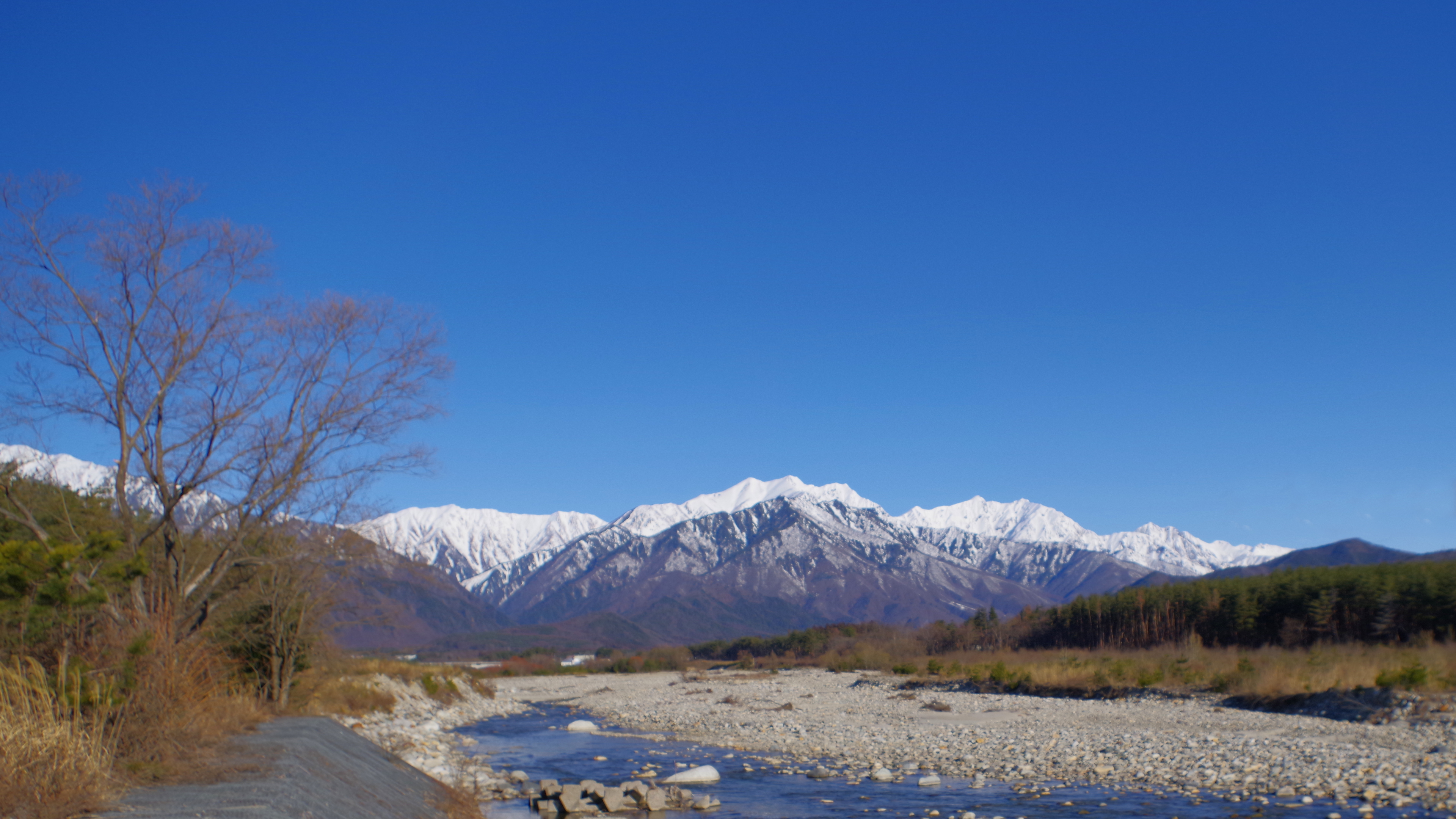 高瀬川から冠雪の美しい 爺ヶ岳、鹿島槍ヶ岳遠望